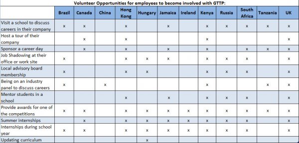 Employees of our Global Partners and local partners who are interested in volunteering can review the chart below to see the kinds of volunteer opportunities available in each GTTP country. Please contact the Director for programs you are interested in at the email shown below.